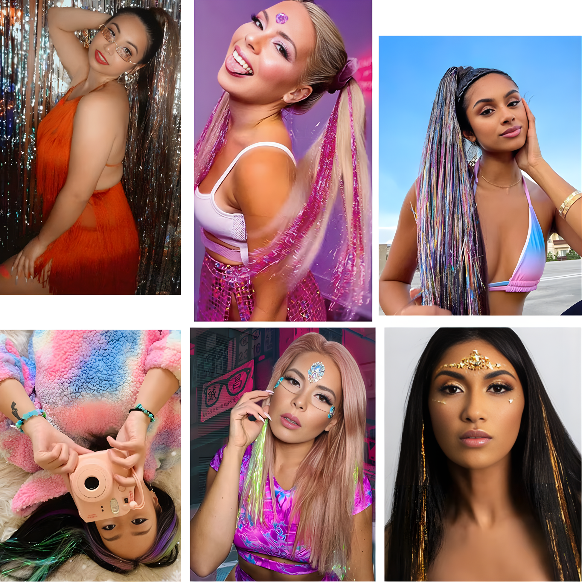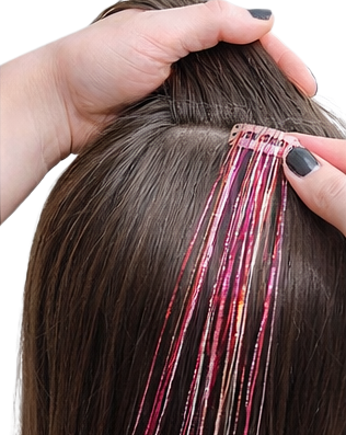 Nuestros Tinsel Hair Clip-In aportan brillo instantáneo sin dañar tu cabello.